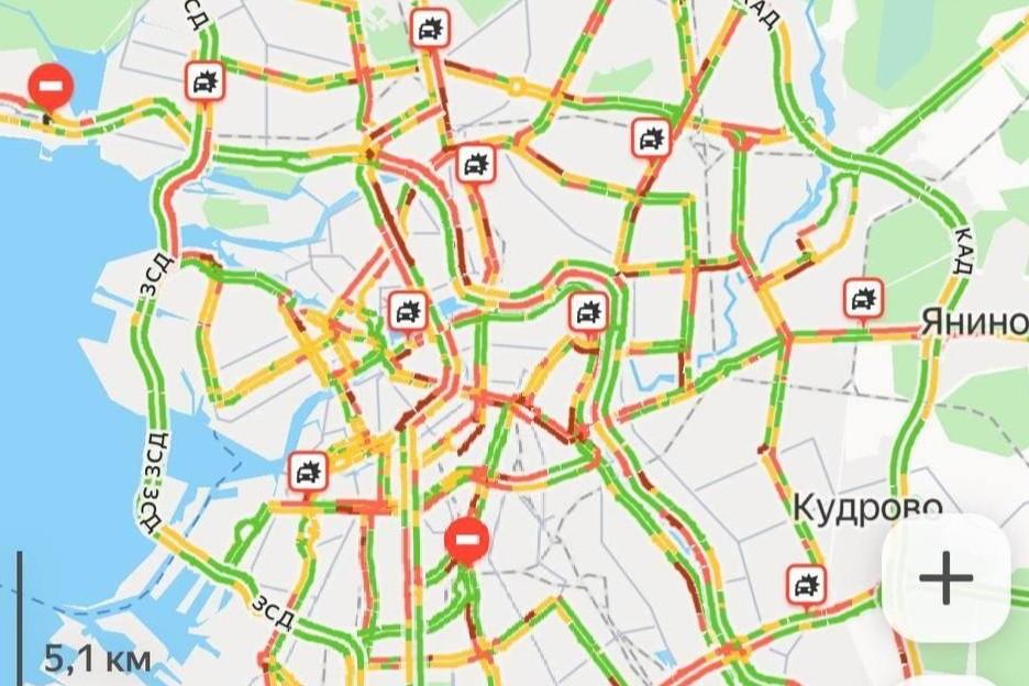 Дороги Петербурга побагровели до 8 баллов. Так будет еще час